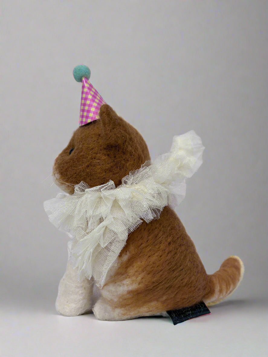 He’s the undisputed king of the party realm, ruling with glitter, charm, and a pom-pom crown. With his pink-checkered hat perched proudly atop his head and a ruffled collar that screams “VIP only,” he struts into every celebration like it’s his coronation. His light brown fur and expressive eyes radiate confidence, and he’s convinced the disco ball spins just for him. Whether it’s a moonlit masquerade or a chaotic carnival, this plush monarch of merriment brings the sparkle, the sass, and the soundtrack. Long live the Party King.